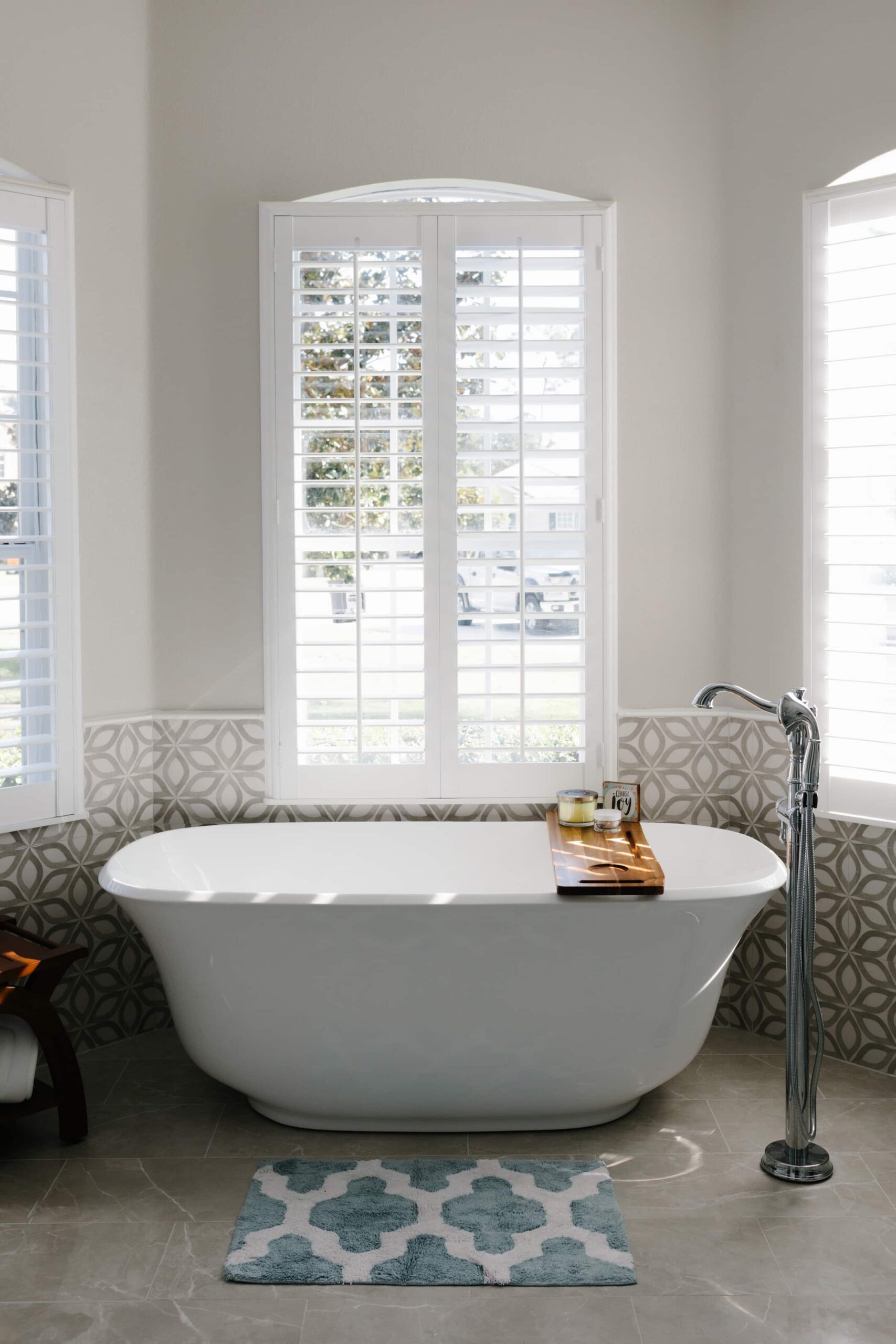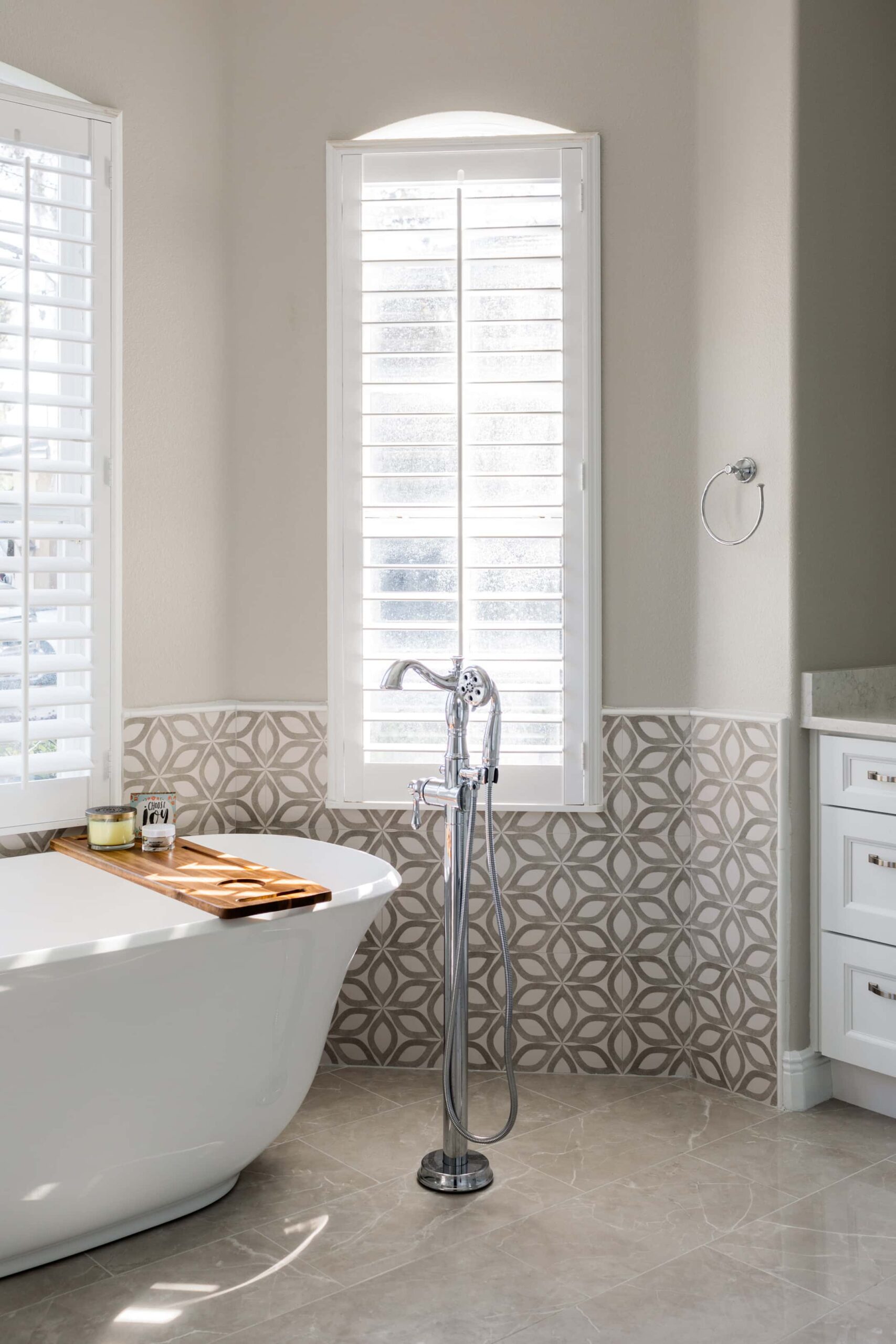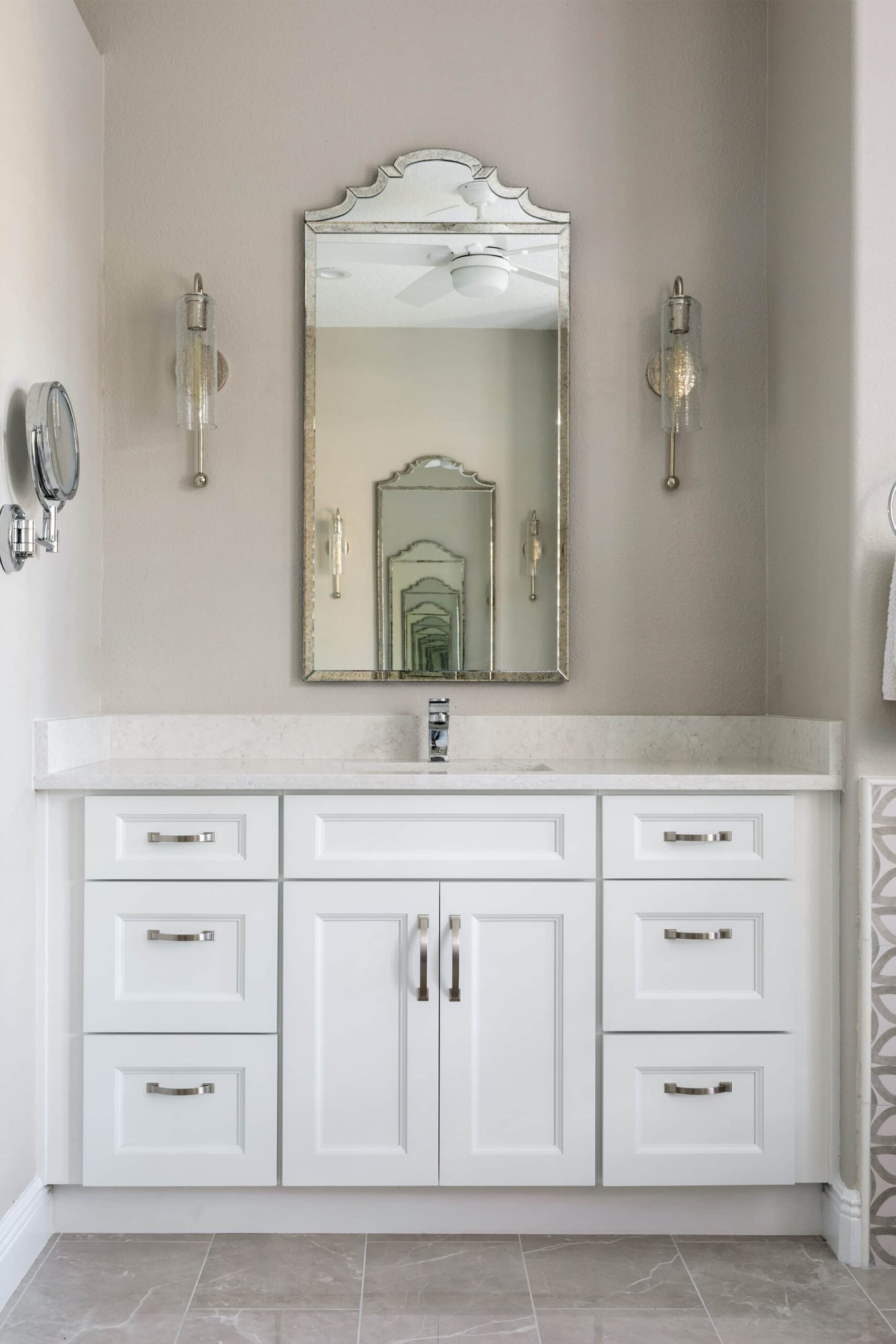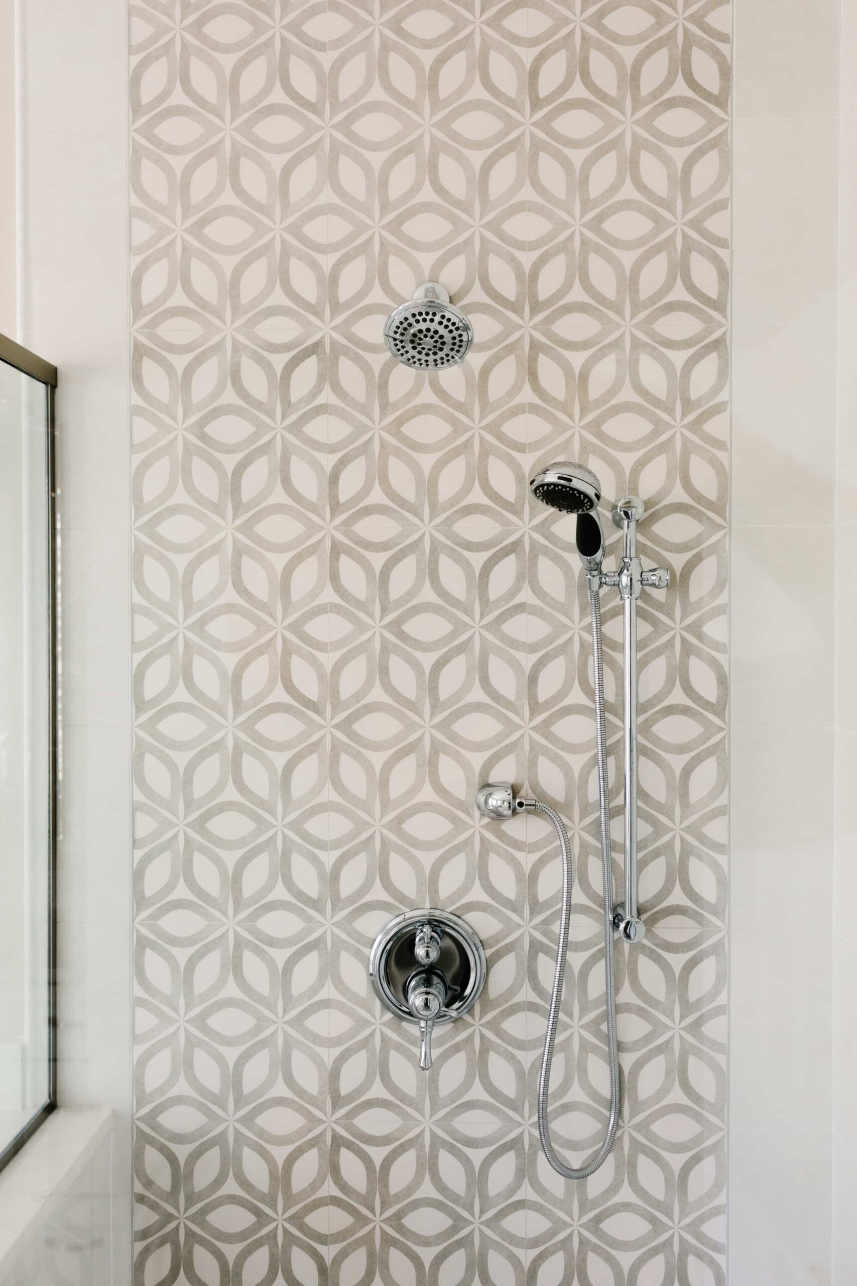 The tile design plays a pivotal role in this transformation. Large-format porcelain tiles in soft gray tones were selected for the flooring and shower walls, contributing to a sense of openness and continuity. A frameless glass shower enclosure further amplifies the airy feel, allowing the tile work to take center stage.